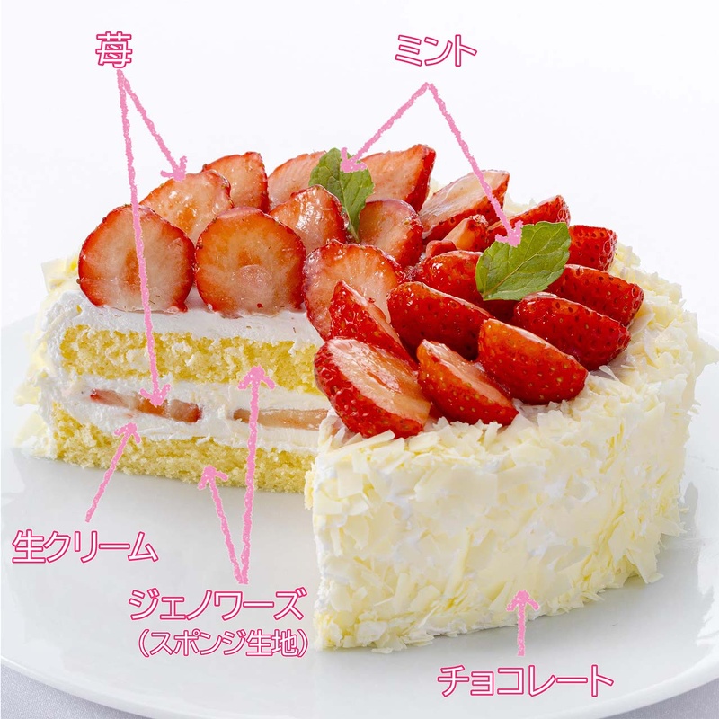 苺(国産、アメリカ産)、生クリーム、卵、グラニュー糖、薄力粉、チョコレート、バター、牛乳、水あめ、ゼラチン、洋酒、ミント/ゲル化剤(増粘多糖類)、(一部に乳成分、小麦、卵を含む)