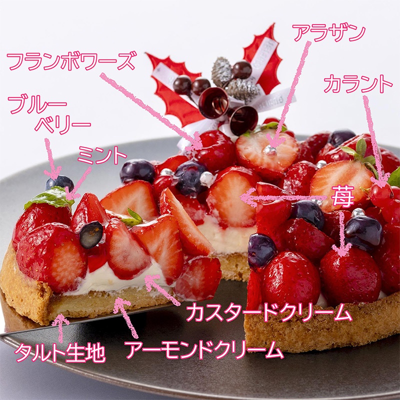 甘みのある生地にアーモンドクリームを絞り焼き上げたタルトに、カスタードクリームを敷き詰め、甘酸っぱい苺とブルーベリー、フランボワーズをたっぷりトッピングしたクリスマス限定のスペシャルタルトです。